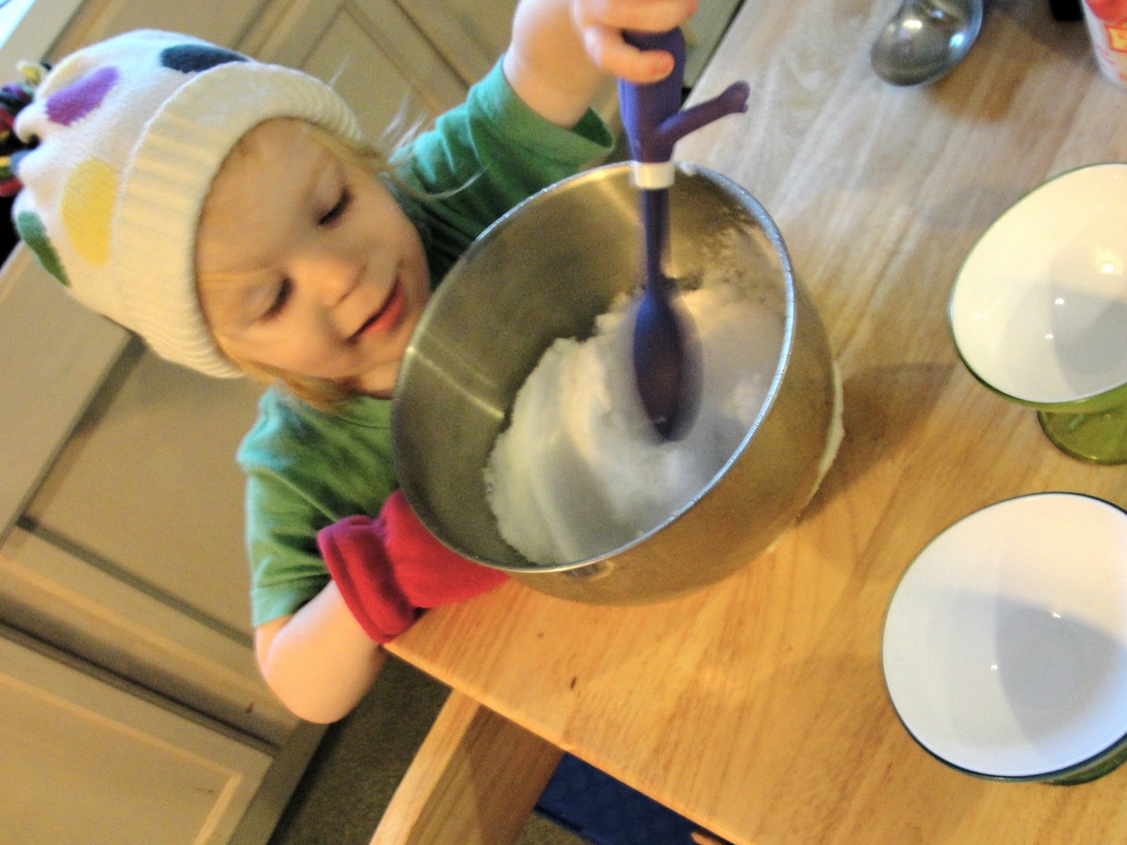Well, after the overloaded sugar batch, we decided to give it another go. This one turned out much much nicer. We used more snow, we colored it, and we let it re-freeze a bit after mixing....which gave it a better consistency too.